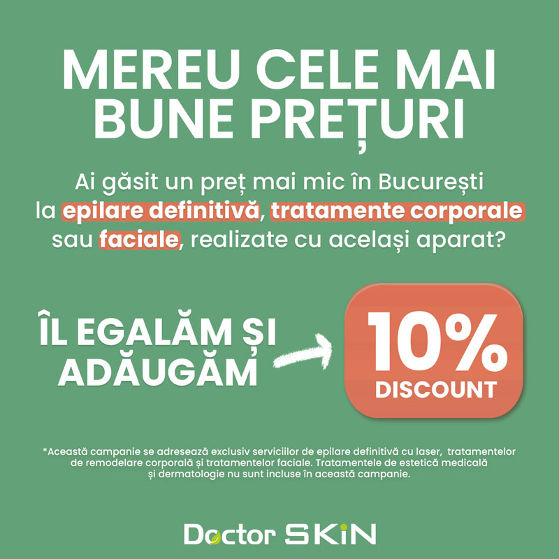 Această selecție, creată special pentru tine sub marca Doctor SKiN Outlet area, reprezintă opțiuni inteligente și eficiente, la preț redus. Te invităm să vii în clinicile noastre pentru a le descoperi și pentru a te bucura de rezultate excepționale, fără să-ți sacrifici bugetul!